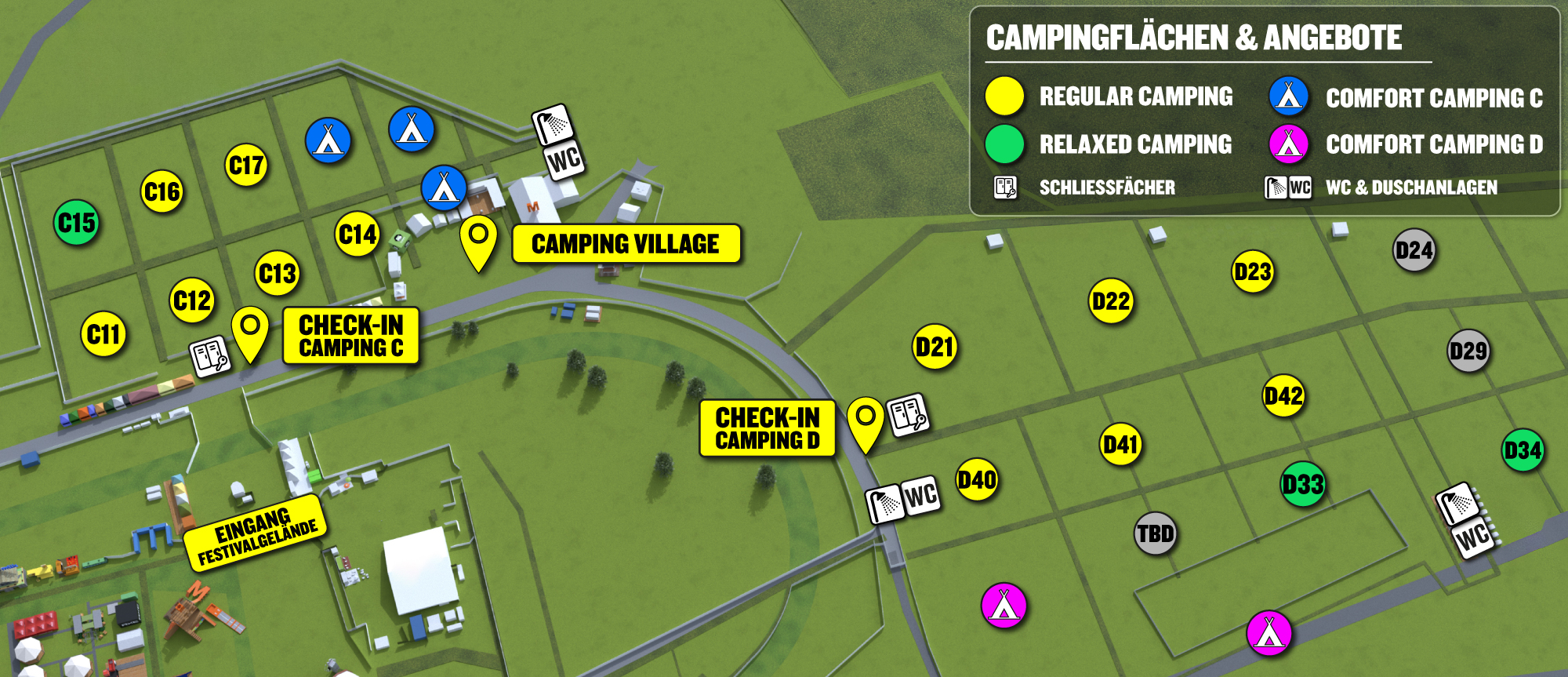 Wir bieten ein Regular Camping, Relaxed Camping und Comfort Camping auf den Campingplätzen C und D an. Damit alle Besucher:innen genügend Platz für den Aufbau ihres Lagers haben, werden bei den Camping Upgrades 12m2 zur Verfügung gestellt. Weitere Informationen erhältst du hier: